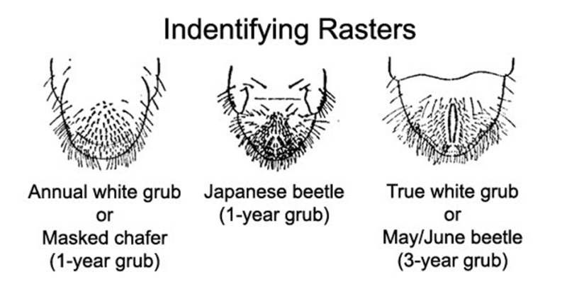 Figure 1. Hair patterns on the rear ends of white grubs can be used to identify the species. A 10x hand lens is perfect for this task. Image from extension.entm.purdue.edu